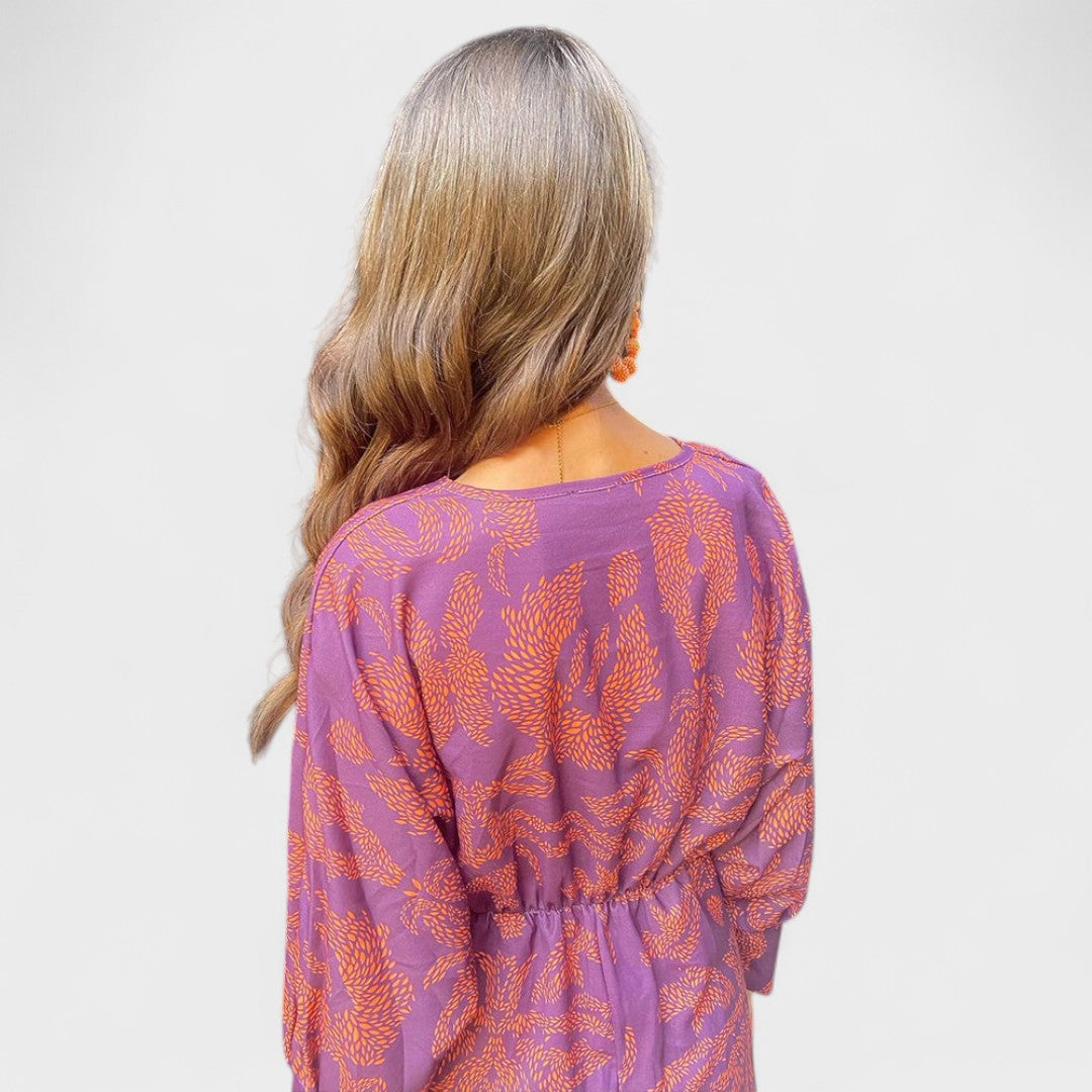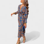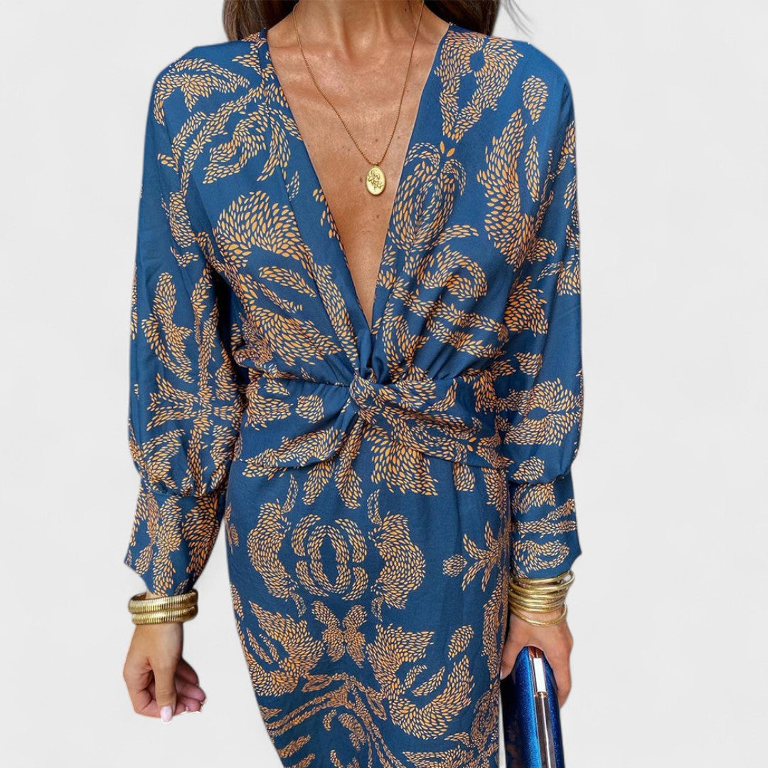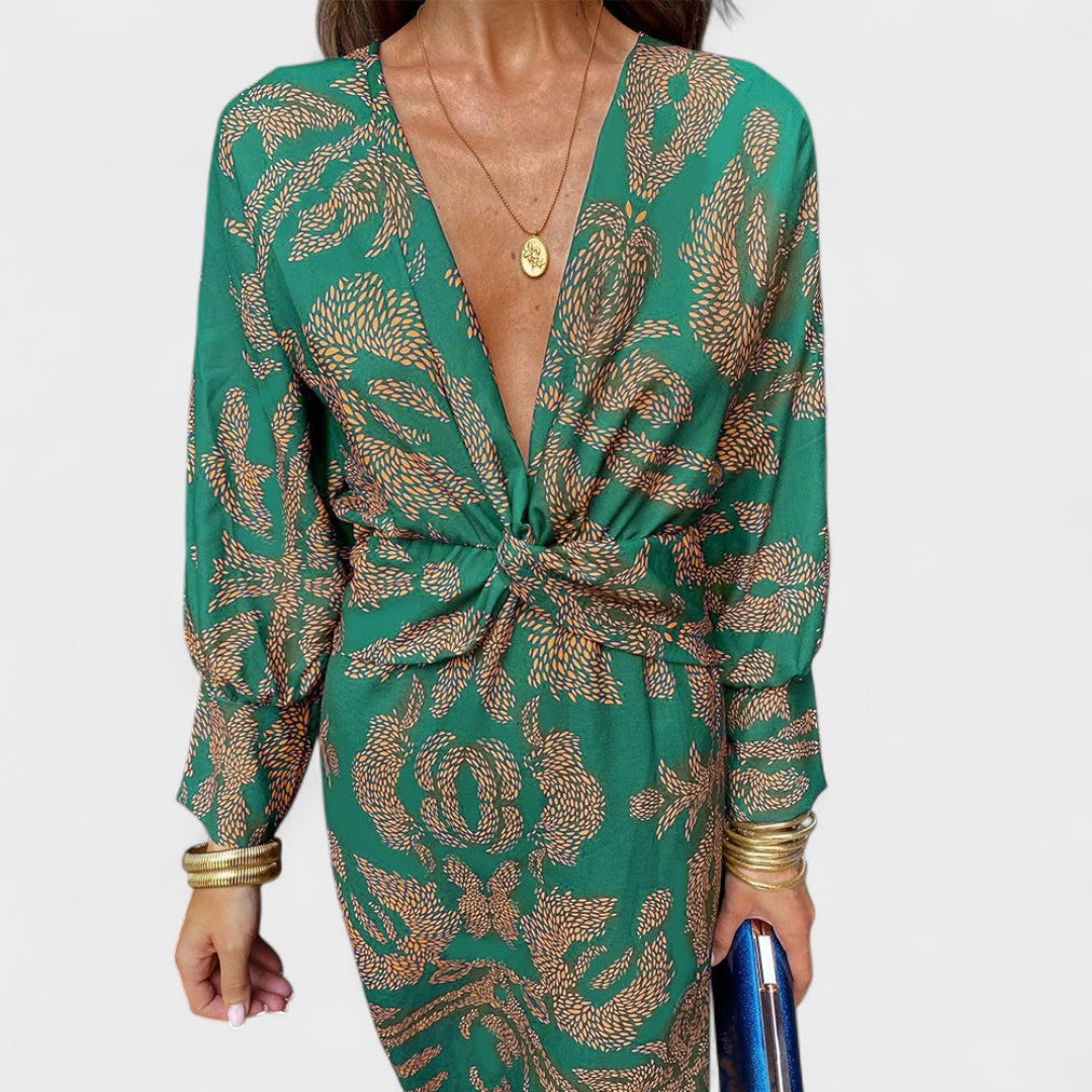 Тази рокля се отличава с красивата си шарка и женствения си кройка, която подчертава талията. Дългите ръкави и дълбокото V-образно деколте ѝ придават изискан вид, докато ефирният материал осигурява лекота и комфорт. Идеална е за дневни тържества, романтични вечери или летни събития на открито.