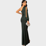Тази вечерна рокля излъчва изтънченост и модерен дизайн. Асиметричният крой с едно ръкави и ефектният набръчкан детайл в талията подчертават женствената силуета, докато дълбокият разрез добавя доза sensuality и елегантност. Идеална е за тържествени поводи, гала вечери или специални събития, на които искате да блеснете и да оставите незабравимо впечатление.