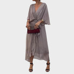Тази елегантна дантелена рокля е перфектното съчетание на изисканост и женственост. С прозрачни ръкави и летяща кройка, тя предлага доза блясък, без да нарушава комфорта. Дълбокото V-образно деколте и детайлите в талията подчертават фигурата по нежно и изтънчено начин, правейки тази рокля идеален избор за вечерни излизания, тържества или специални събития.