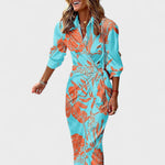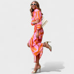 Риза-крой с елегантна яка и копчета, лека и податлива тъкан, която красиво пада, и флуидна силуета с изискан разрез – тази шарена дълга рокля е създадена за моментален ефект. Дискретно подчертава талията и осигурява свобода на движението, така че също толкова добре функционира в дневни комбинации и вечерни поводи.