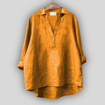 Елегантна ленена блуза в бяло, която излъчва свежест и вечен стил. Има V-изрез с дискретно закопчаване, дълги ръкави, които могат да се навиват, и асиметричен край с по-дълга задна част, осигуряваща комфорт и лекота на движението. Идеалният избор за стилни летни комбинации или елегантен ежедневен вид.