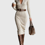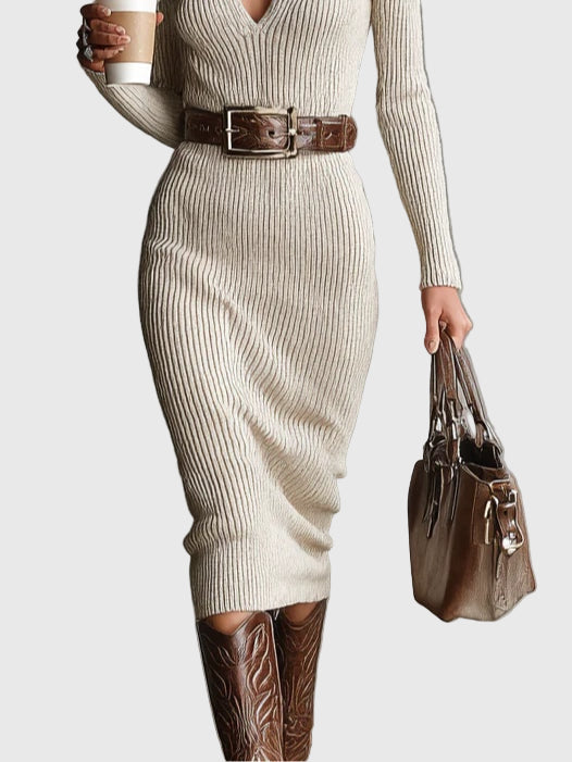 Представяме ви Миди рокля Валерие, изработена от мека и еластична материя, която осигурява зашеметяваща прилепнала силуета с елегантен акцент. Полу-високото V-образно деколте и дългите ръкави добавят слой на изтънченост, правейки я идеален избор както за ежедневна елегантност, така и за официални поводи.