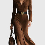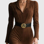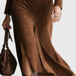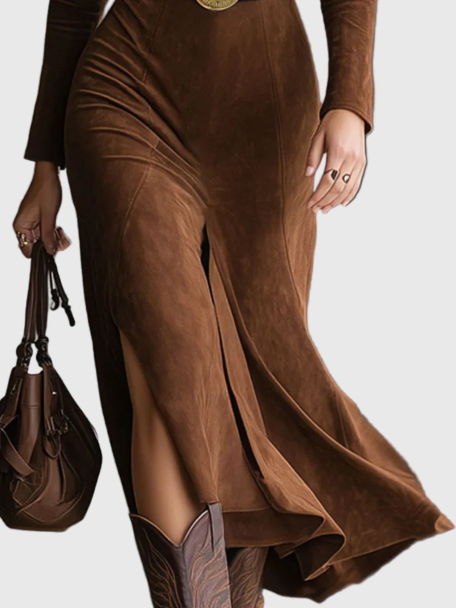 Пола Eleanor | Пола от изкуствен велур до коляното добавя изискан западен щрих към съвременния женски стил. Изработена от изключително мек изкуствен велур, тази подчертаваща пола до коляното разполага с структуриран яка и елегантен страничен разрез за без усилие движение. Проектирана да се чувства толкова добре, колкото изглежда, тя пада красиво, предлагайки комфорт през целия ден — перфектна за изискана ежедневна носка или за релаксиращи уикенд излизания.