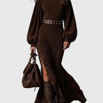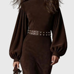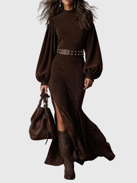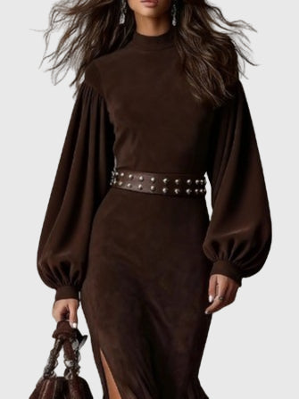 Роклята Хариет | Винтидж рокля с ръкави-лампи внася класическа женственост в настоящето. Изработена е от мек плат с велурен ефект с изискан поло яка и грациозни ръкави-лампи, тя оформя красиво, като предлага комфорт през целия ден. Детайл с преден цип и плавен подгъв добавят движение и изтънченост — перфектната комбинация от наследствен стил и модерна изтънченост.