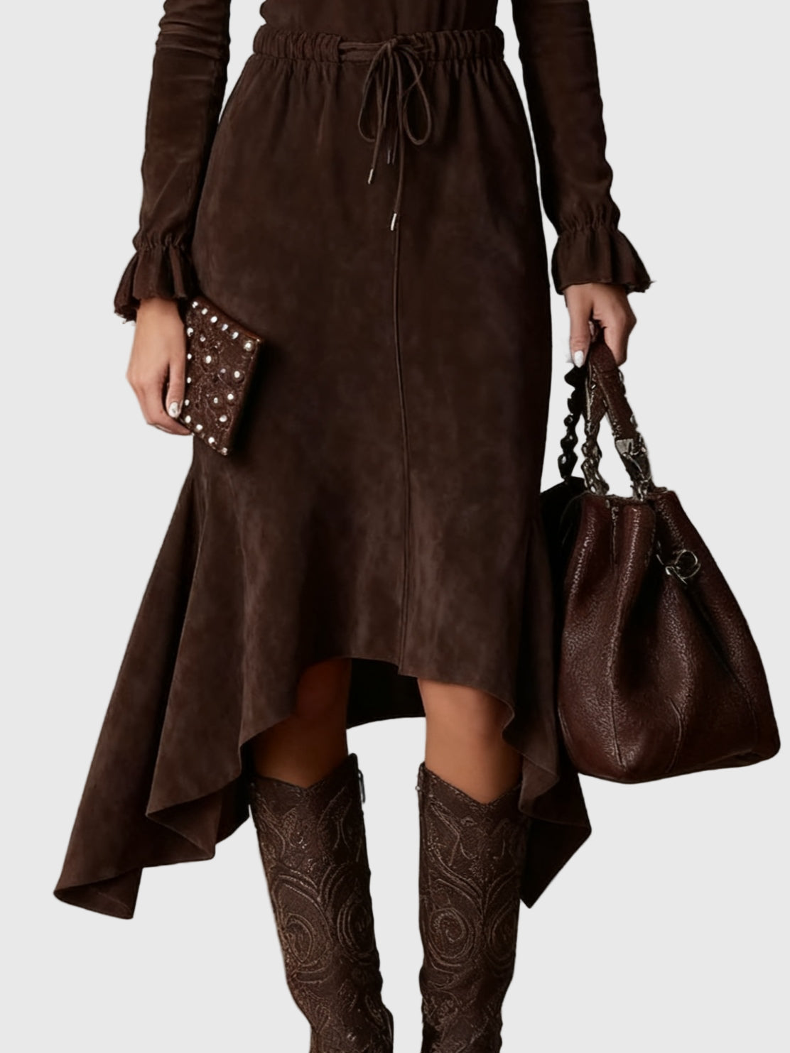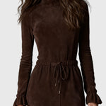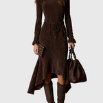 Роклята Isla | Суede Миди съчетава богата, мека суеде текстура с изискана, женствена форма. С елегантно полувисоко деколте, плавни маншети и подчертаваща връзка на талията, тя предлага повишен стил с без усилие удобство. Асиметричният подгъв добавя грациозно движение — изискан избор за вечери навън, специални събирания или елегантни дневни моменти.