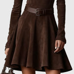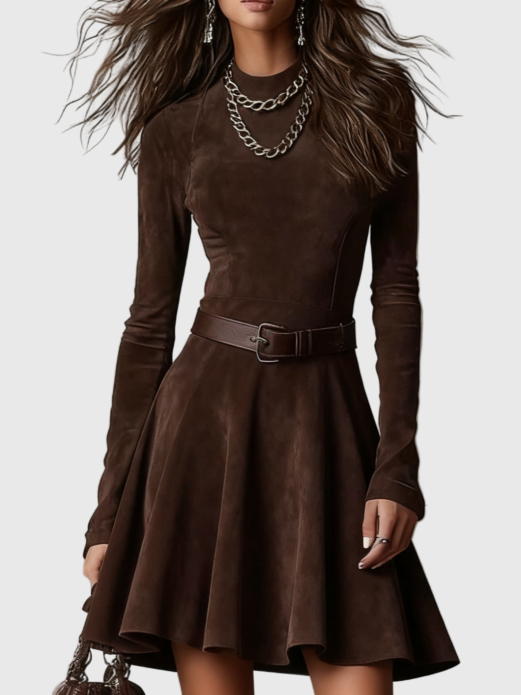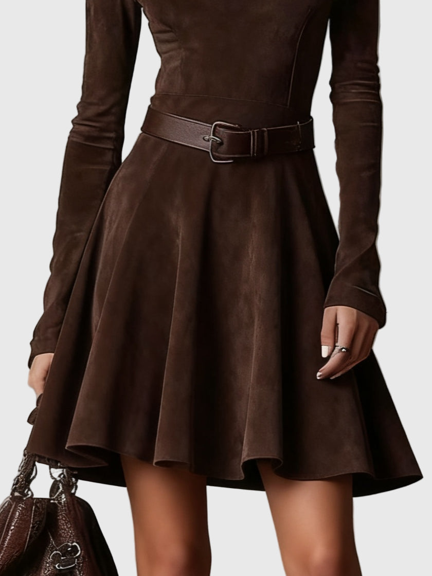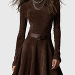Сукнята Meredith | Винтидж Сукня от Замша улавя класически шарм с модерен обрат. Изработена от мека изкуствена замша с уютна висока яка и разширена талия, тя предлага комфорт, топлина и ненатрапчива изисканост. Игривата мини силует придава младежка енергия, докато гладкото усещане на замшата добавя нотка на всекидневна луксозна елегантност — идеална за стилно, но без усилие облекло през по-хладните сезони.