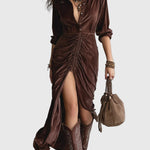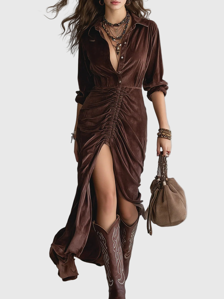 Открийте винтидж кадифената миди рокля Thalisse, уникално парче, което безпроблемно съчетава вечна елегантност с модерен стил. Изработена от висококачествено кадифе, тази рокля предлага луксозно усещане и ласкателен силует, което я прави перфектна за всякакъв повод.