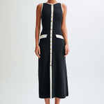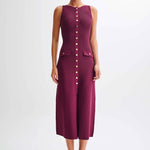 Елегантна плетена рокля без ръкави с дълги копчета. Нейната права линия предоставя вечна елегантност, докато копчетата на джобовете добавят изискан детайл. Идеална за появи от сутрин до вечер.