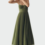Елегантна и женствена рокля с тънки презрамки и тесен корсет, който подчертава силуета. Плисирана пола до midi дължина предлага уникално движение и вечна елегантност. Идеална за елегантни поводи, от сватби до официални събития.