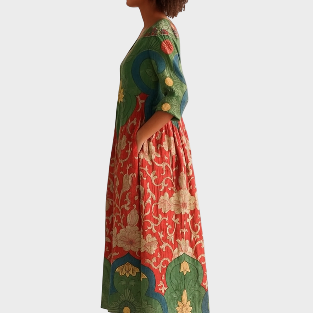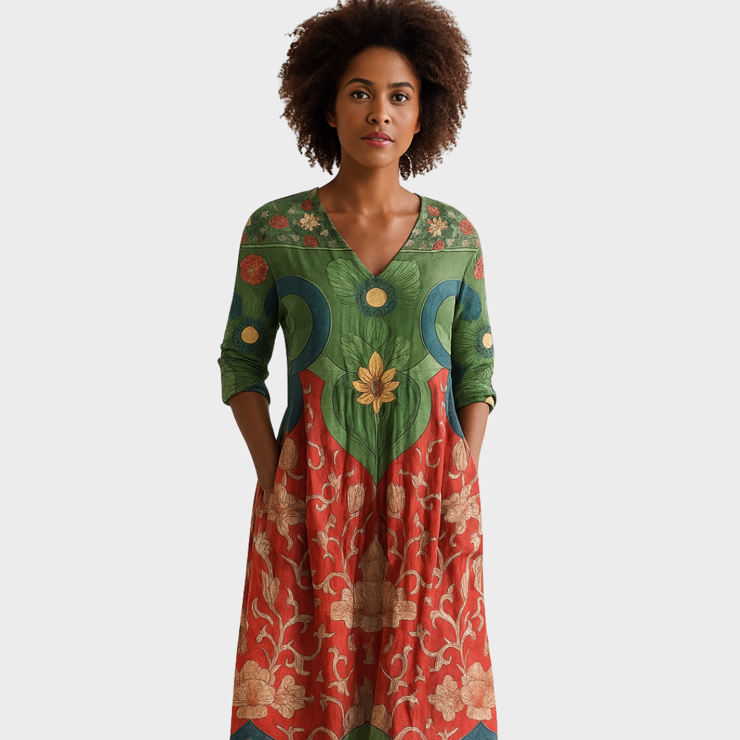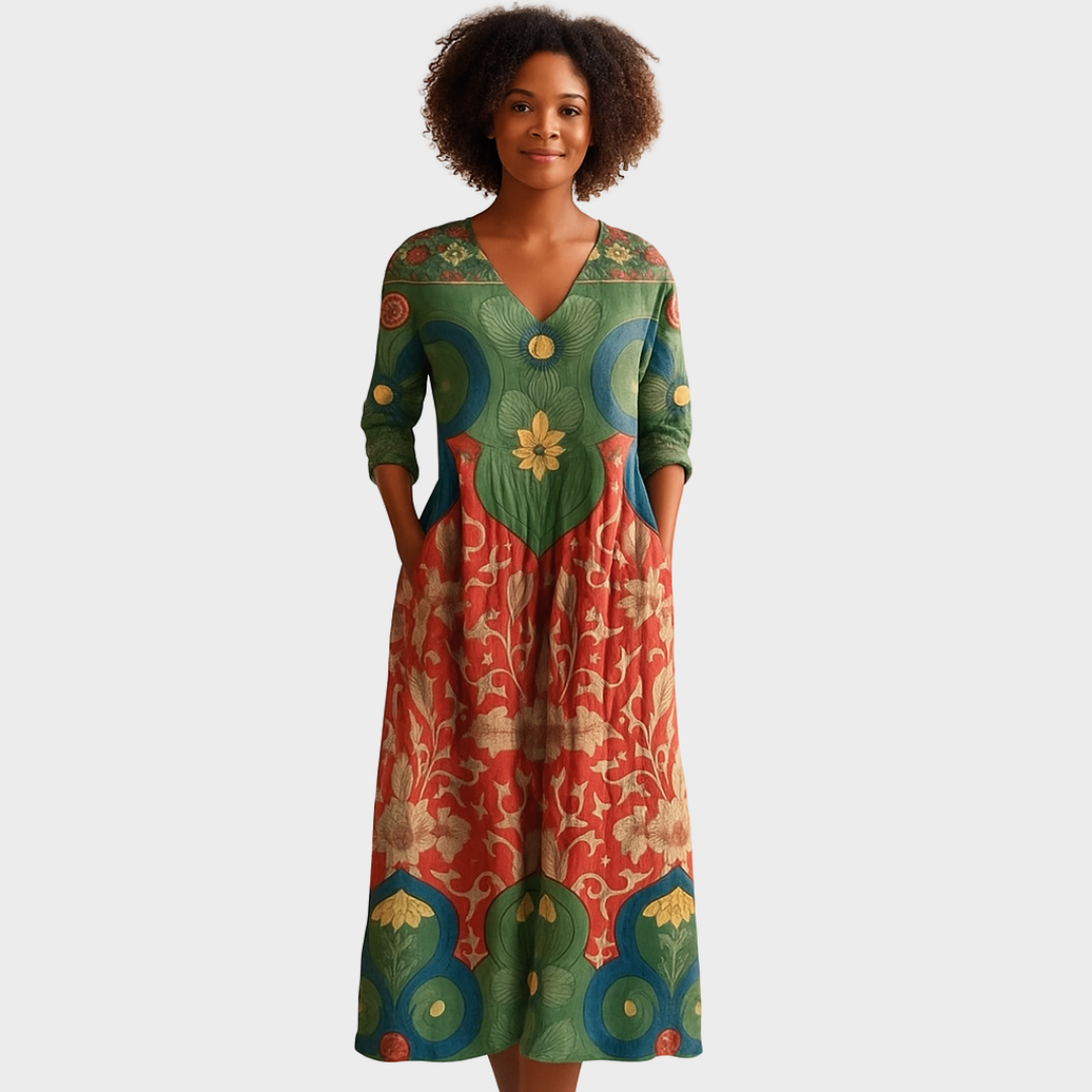 Тази рокля съчетава артистичен дизайн и комфорт в перфектен баланс. С богат етно мотив, V-образно деколте и практични джобове, тя е идеална за жени, които обичат оригиналността и свободата в облеклото. Леката кройка позволява лесно движение, а впечатляващите детайли придават специален чар на всяка повода.