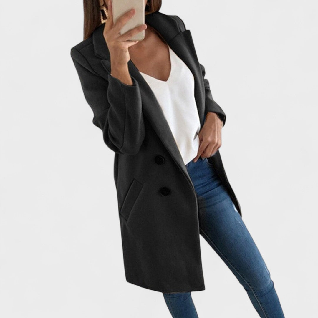 • Изгоден крой – чисти линии, ревери и дължина, която визуално удължава фигурата.