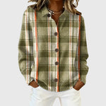 Блузата Норис има мъхесто зелено основание с деликатни бежови нюанси и забележителна ивица в топло оранжево. Карето изглежда спокойно, но все пак изразително благодарение на ярките вертикални акценти. Класическата яка и закопчалка придават на цялостния вид познат и универсален характер.