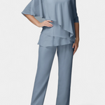 Софистицирана елегантност с разкрепостена структура. Комплектът Лана съчетава безръкавен топ с широк деколте и панталони с висока талия и летящи крачоли, създавайки изтънчен и удобен силует. Неговият въздушен и лек материал го прави идеален избор за деликатен и самоуверен вид.