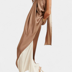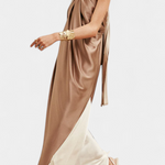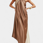 С дизайн, който съчетава sensualnost и модерност, роклята Петра се отличава със своя халтер изрез и напълно открити гърба. Нейната флуидна силуета, заедно с играта на блокове цветове, създава елегантно и авангардно визуално впечатление. Перфектна за тези, които искат да блеснат с увереност на всяко специално събитие.