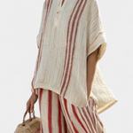 Отпуснете се с морския характер. Облеклото Дейзи комбинира широка блуза с V-образно деколте и широки панталони с вертикални ленти, които удължават силуета. Неговият флуиден дизайн и текстилният материал го правят идеален избор за наслада в светлите дни с комфорт и стил.