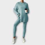 Този комплект от ребрист трикотаж е идеален избор за тези, които търсят практичност с нотка елегантност. Персонализираният крой и удължената дължина на блузата създават модерен вид, перфектен за носене вкъщи, на работа или на неформални излети.