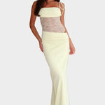 Издигнете своята женственост и елегантност с тази дълга рокля в мека пастелно жълта нюанса. Комбинацията от фина дантела на деколтето с тясната долна част създава изключително привлекателен и изискан вид, идеален за вечерни излизания или специални поводи.